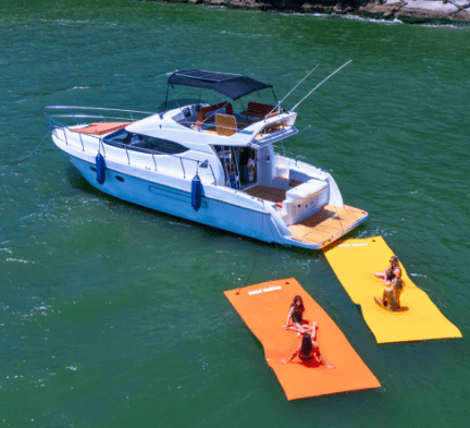 Os tapetes e plataformas flutuantes funcionam como uma extensão da embarcação. Posicionados ao lado do barco, eles criam uma área estável sobre a água para descanso, brincadeiras ou simplesmente para sentar e conversar enquanto os pés ficam no mar. De acordo com Alessandra: “O conforto também desempenha papel essencial. Plataformas e tapetes flutuantes criam áreas de convivência na água, ampliando o espaço útil da embarcação.” Esses acessórios são especialmente valorizados em ancoragens em praias e enseadas, onde o objetivo é aproveitar o local com calma e conforto.